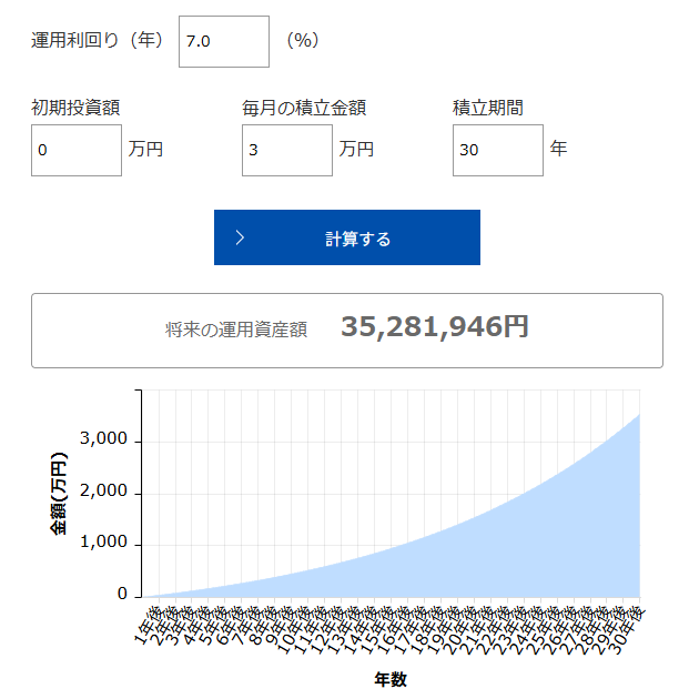 月3万円 × 30年 × 年利7% で運用した場合、