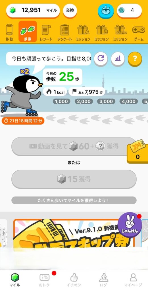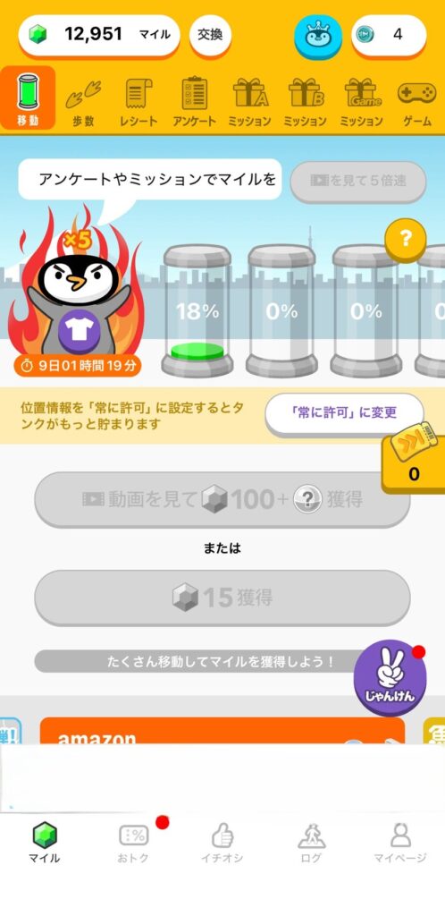 「動画を見て100ポイント+〇獲得」ボタンが押せます。